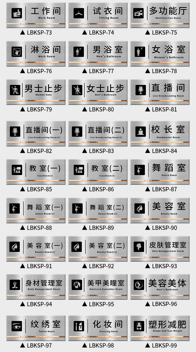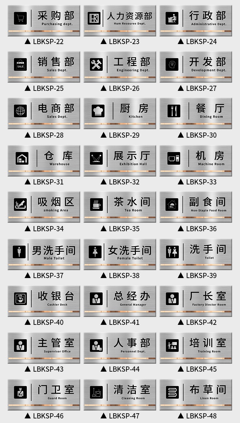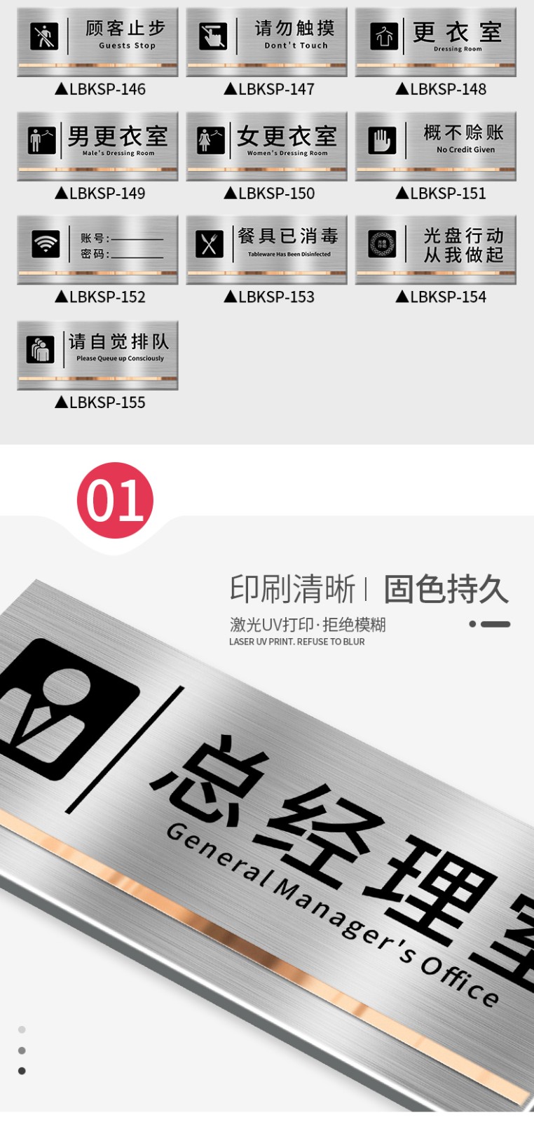 我們匠心打造辦公室門(mén)牌、不銹鋼標(biāo)示牌、部門(mén)科室牌,以及總經(jīng)理室、會(huì)議室與金屬洗手間標(biāo)識(shí)。采用高品質(zhì)不銹鋼,耐用防腐,彰顯企業(yè)高端品味。門(mén)牌與科室牌設(shè)計(jì)簡(jiǎn)潔大方,信息一目了然;領(lǐng)導(dǎo)室與會(huì)議室標(biāo)識(shí)尊貴獨(dú)特,提升辦公氛圍;洗手間標(biāo)識(shí)則防水防銹,實(shí)用美觀。全方位滿(mǎn)足您的辦公標(biāo)識(shí)需求,讓每一處細(xì)節(jié)都盡顯專(zhuān)業(yè)與雅致。