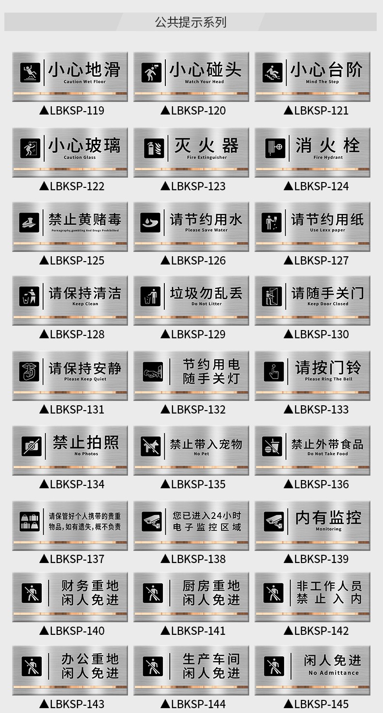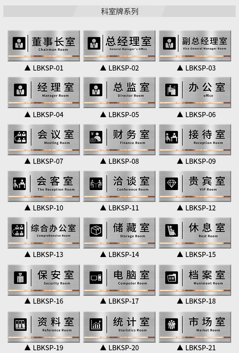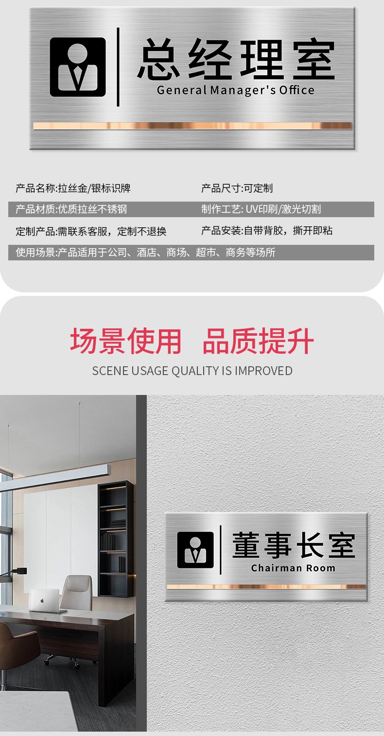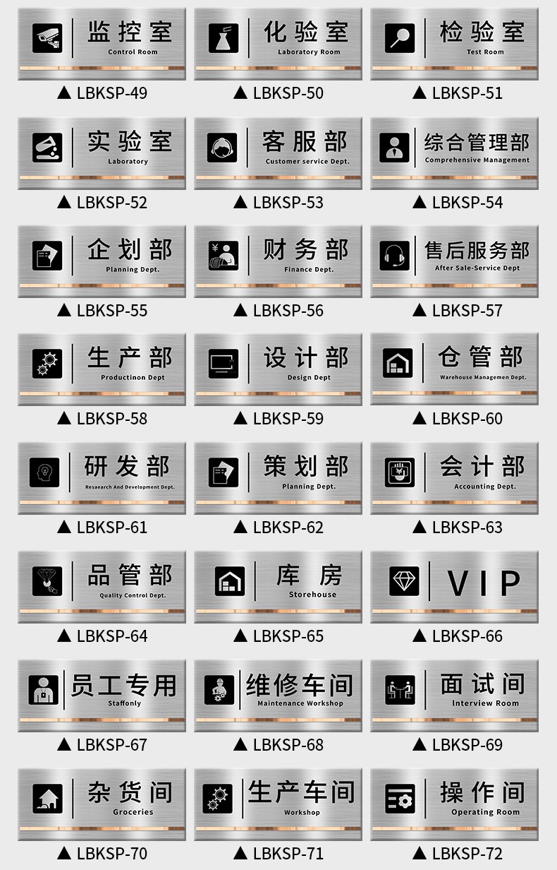 我們匠心打造辦公室門(mén)牌、不銹鋼標(biāo)示牌、部門(mén)科室牌,以及總經(jīng)理室、會(huì)議室與金屬洗手間標(biāo)識(shí)。采用高品質(zhì)不銹鋼,耐用防腐,彰顯企業(yè)高端品味。門(mén)牌與科室牌設(shè)計(jì)簡(jiǎn)潔大方,信息一目了然;領(lǐng)導(dǎo)室與會(huì)議室標(biāo)識(shí)尊貴獨(dú)特,提升辦公氛圍;洗手間標(biāo)識(shí)則防水防銹,實(shí)用美觀。全方位滿(mǎn)足您的辦公標(biāo)識(shí)需求,讓每一處細(xì)節(jié)都盡顯專(zhuān)業(yè)與雅致。