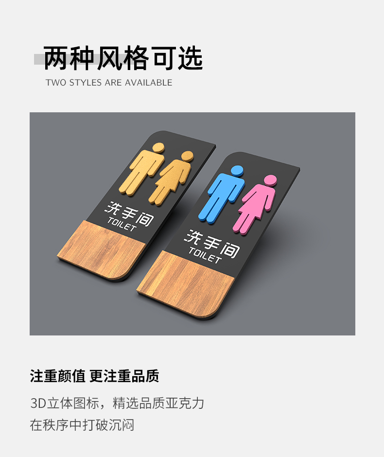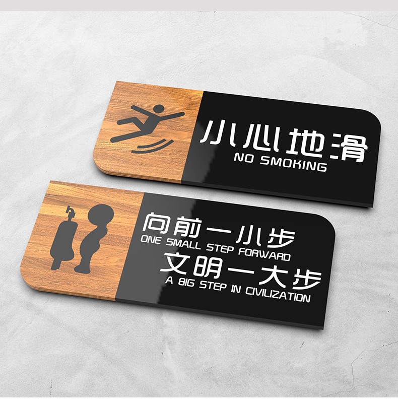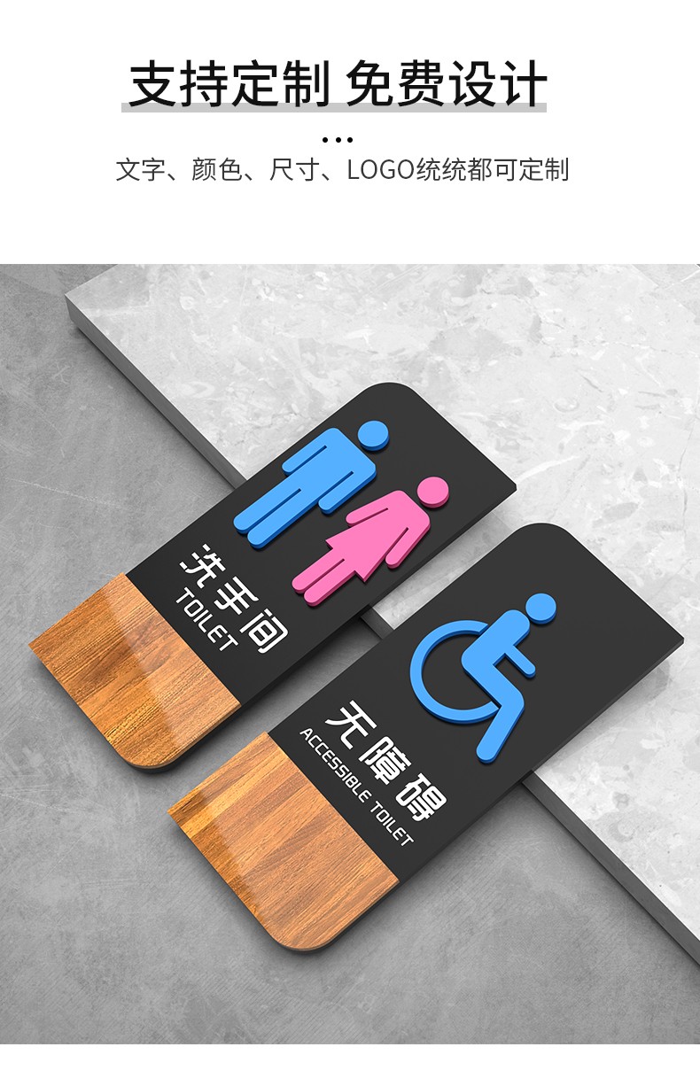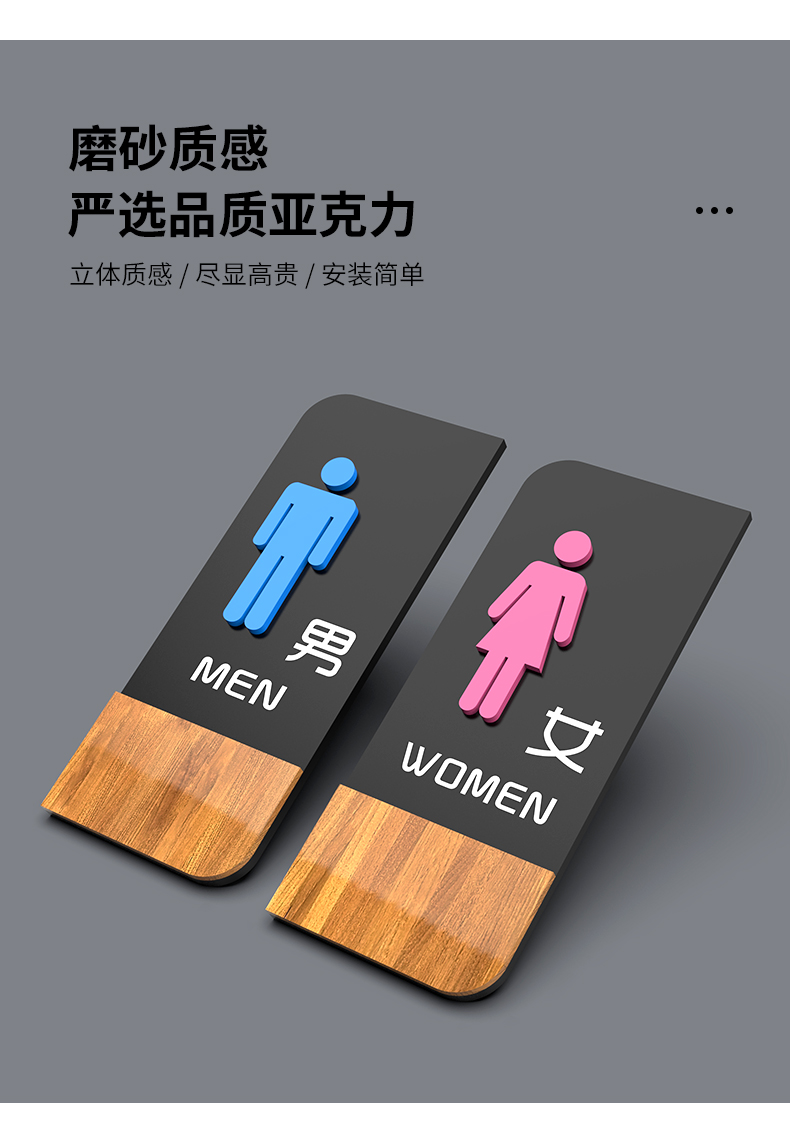我們匠心獨運,推出木紋風(fēng)格男女衛(wèi)生間標(biāo)識牌,將自然元素融入現(xiàn)代設(shè)計。采用高品質(zhì)亞克力材質(zhì),模擬真實木紋質(zhì)感,既環(huán)保又耐用。標(biāo)識清晰,色彩鮮明,輕松指引方向。獨特的創(chuàng)意造型,為洗手間增添一抹溫馨與雅致。無論是商業(yè)場所、辦公大樓還是家庭住宅,都能完美融合,營造舒適便捷的如廁環(huán)境。